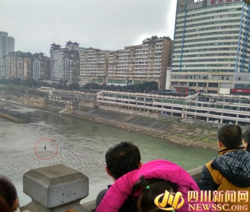 13時30分左右,沱江一橋上走過一名身著青色棉衣的小伙子,在沒人注意到的情況下,他翻上二號橋拱處的護欄。路過群眾大聲呼叫,正準備去拉他時,他縱身一躍跳了下去。群眾頓時緊張起來,心想小伙子兇多吉少。