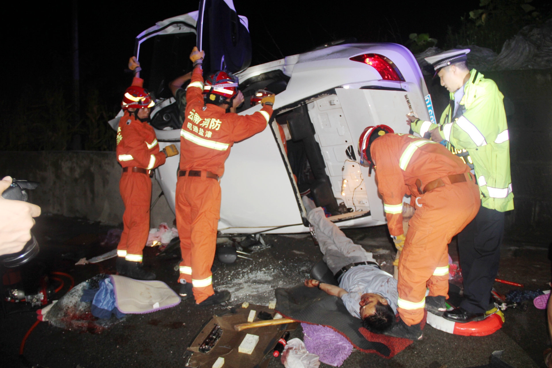 轎車側(cè)翻釀慘禍 鹽津消防雨夜營救被困人員