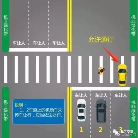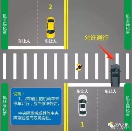 圖為一塊板道路,機非混行,道路狹窄。當有行人通過斑馬線,機動車應停車讓行;當行人通過后,機動車才允許通行