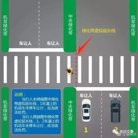 圖為雙向四車道,當行人走在斑馬線中間段,未跨越圖中綠化帶虛擬延長線時,如圖標識的第①車道上的機動車應停車讓行;當行人跨越了圖中綠化帶虛擬延長線,第①、②車道上的機動車均應停車讓行。