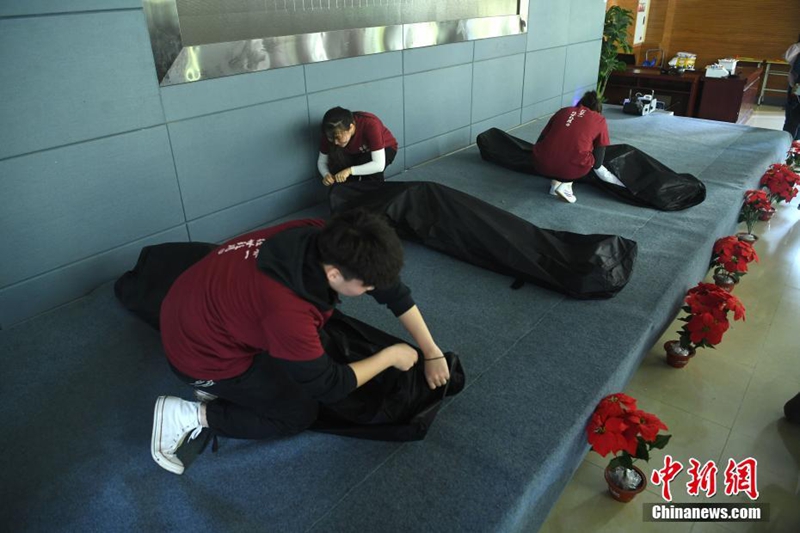 4月7日,以“感悟生命感恩生命”為主題的生命教育體驗(yàn)活動(dòng)在位于重慶市沙坪壩區(qū)的四川外國(guó)語(yǔ)大學(xué)校園內(nèi)舉行。學(xué)生們通過(guò)“孕育體驗(yàn)”、“殘障體驗(yàn)”“死亡體驗(yàn)”等,表達(dá)對(duì)逝去親人的感謝與思念,從中去感悟生命的意義。圖為圖為大學(xué)生躺“裹尸袋”體驗(yàn)“死亡” 。