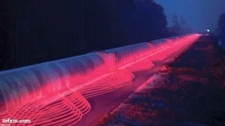 位于路易斯安那州利文斯頓的LIGO天文臺(tái)中一條干涉臂的定時(shí)曝光照,紅色的光代表引力波。
