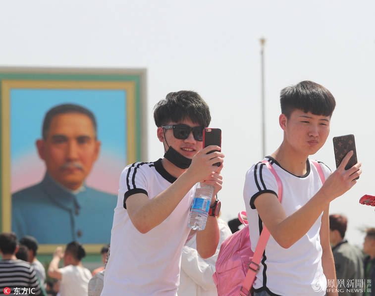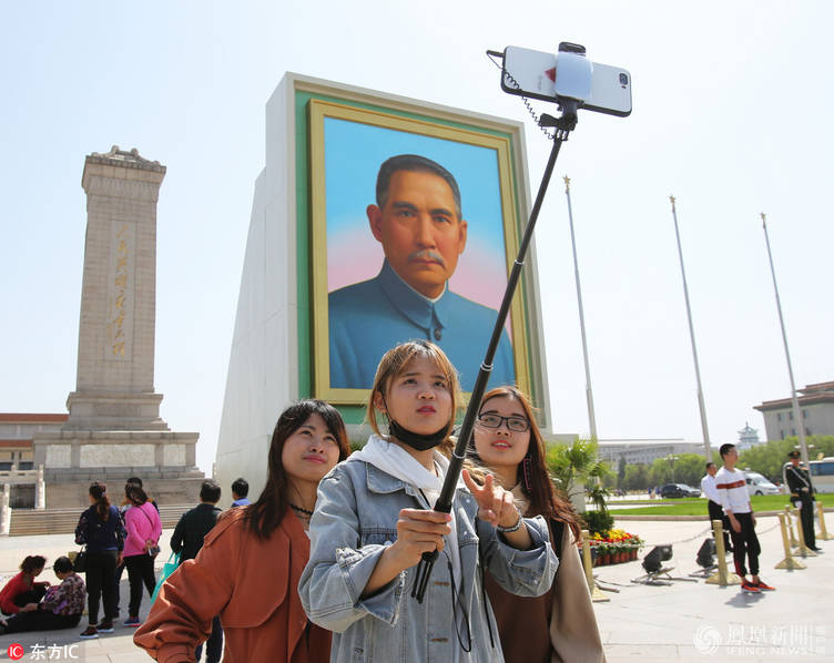 2018年4月27日,北京,游客紛紛在孫中山畫像前拍照留影。當(dāng)天,孫中山巨幅畫像亮相天安門廣場(chǎng),迎接即將到來的五一國(guó)際勞動(dòng)節(jié)。
