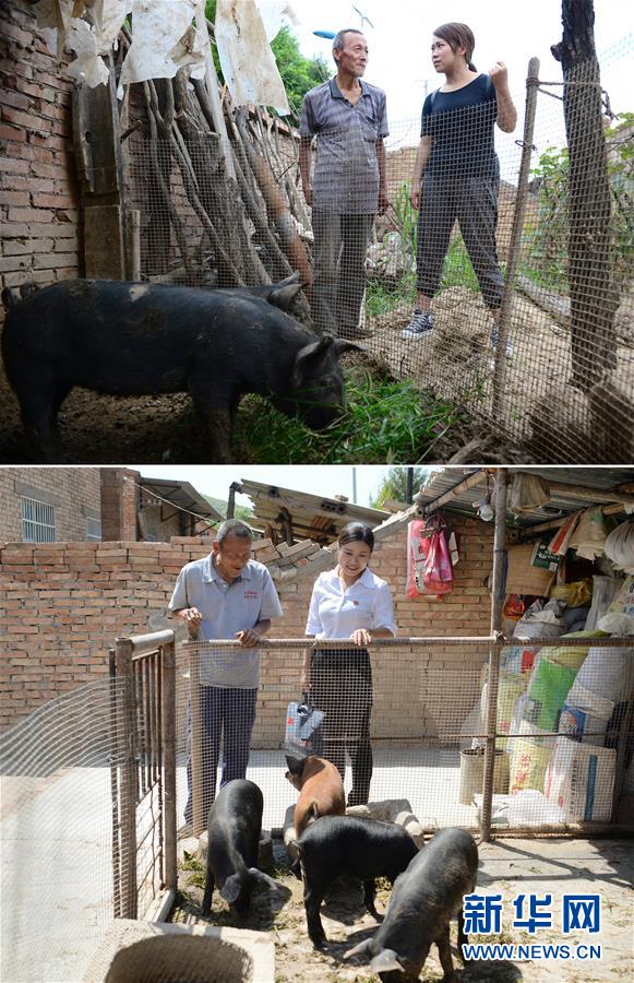 這是一張拼版照片,上圖為:張文妮(右)在榆樹(shù)村村民楊春芳家查看黑豬養(yǎng)殖情況(2016年7月28日攝);下圖為:張文妮(右)查看楊春芳家改造擴(kuò)大后的豬舍,黑豬數(shù)量已由2016年的兩頭變?yōu)楝F(xiàn)在的四頭(6月22日攝)。