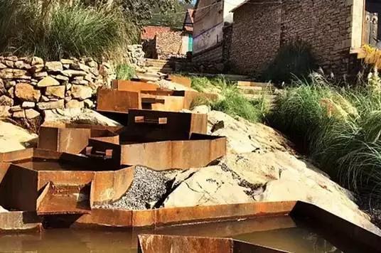 廣場(chǎng)東側(cè)的一個(gè)巷子,原路面被做成水泥路面,在去掉水泥,恢復(fù)生態(tài)路面的過程中,挖出了大量的石灰?guī)r原石,與太湖石一致,于是,在這個(gè)基礎(chǔ)上做了一個(gè)藝術(shù)裝置,用廢舊鋼板焊接了一個(gè)跌水池,嵌入到原始石頭的間隙中,謂之青泉石上流。又在石頭的一側(cè)栽植了蒲葦,蒲葦與石頭又應(yīng)了《孔雀東南飛》里的一句詩"蒲葦韌如絲,磐石無轉(zhuǎn)移。"