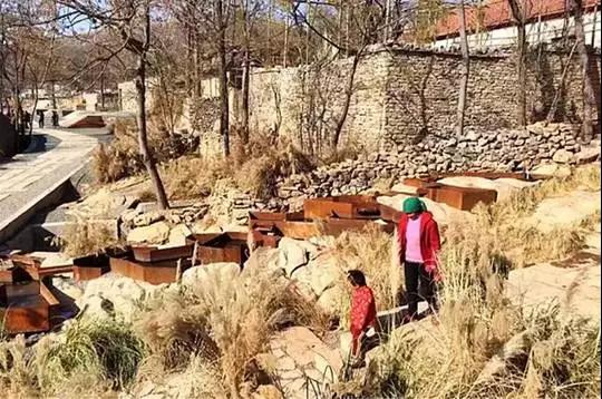 鄉(xiāng)村本來就是海綿的,但在新農(nóng)村建設(shè)的過程中,村子里的道路全部都給硬化了,一是因?yàn)檐囆械男枰,二是為了去掉泥巴路,村子的詩意蕩然無存了。改造中重新破除水泥路,改為步行路,恢復(fù)滲水功能,道路采用老石板鋪裝,結(jié)合石子,不僅可以滲水,又滿足了下雨沒有泥巴的需求。破碎掉的混凝土,重新用作鋪地材料,中間留有縫隙,生長(zhǎng)小草。