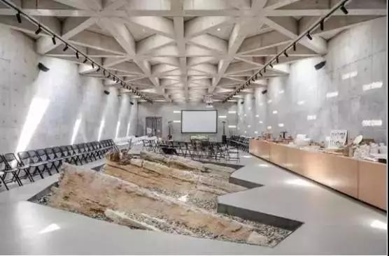 建筑拆除模版后,在四周基礎(chǔ)的內(nèi)部下挖,下挖的過程中,發(fā)現(xiàn)了一組獨(dú)立的巨石,順勢(shì)把石頭清理出來,保留在建筑中,中間有一口水井,所以就形成了一個(gè)室內(nèi)山水。