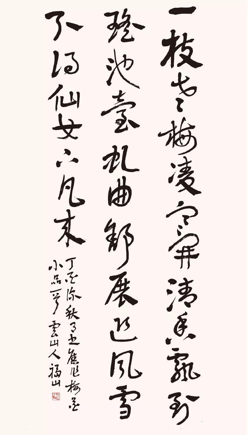 《題梅花小品》 一枝老梅凌寒開,清香飄到瑤池臺(tái)。虬曲舒展迎風(fēng)雪,引得仙女下凡來(lái)。尺寸:69cm×138cm 材質(zhì):紙本水墨 年代:2017