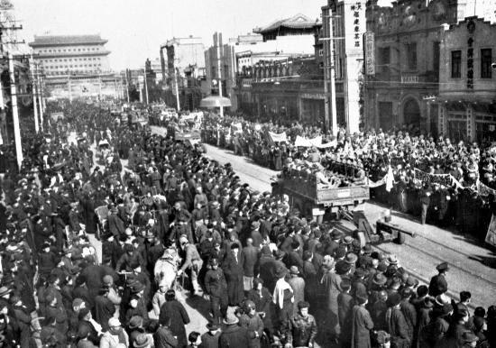 北平市民在正陽(yáng)門大街上夾道歡迎參加入城式的人民解放軍