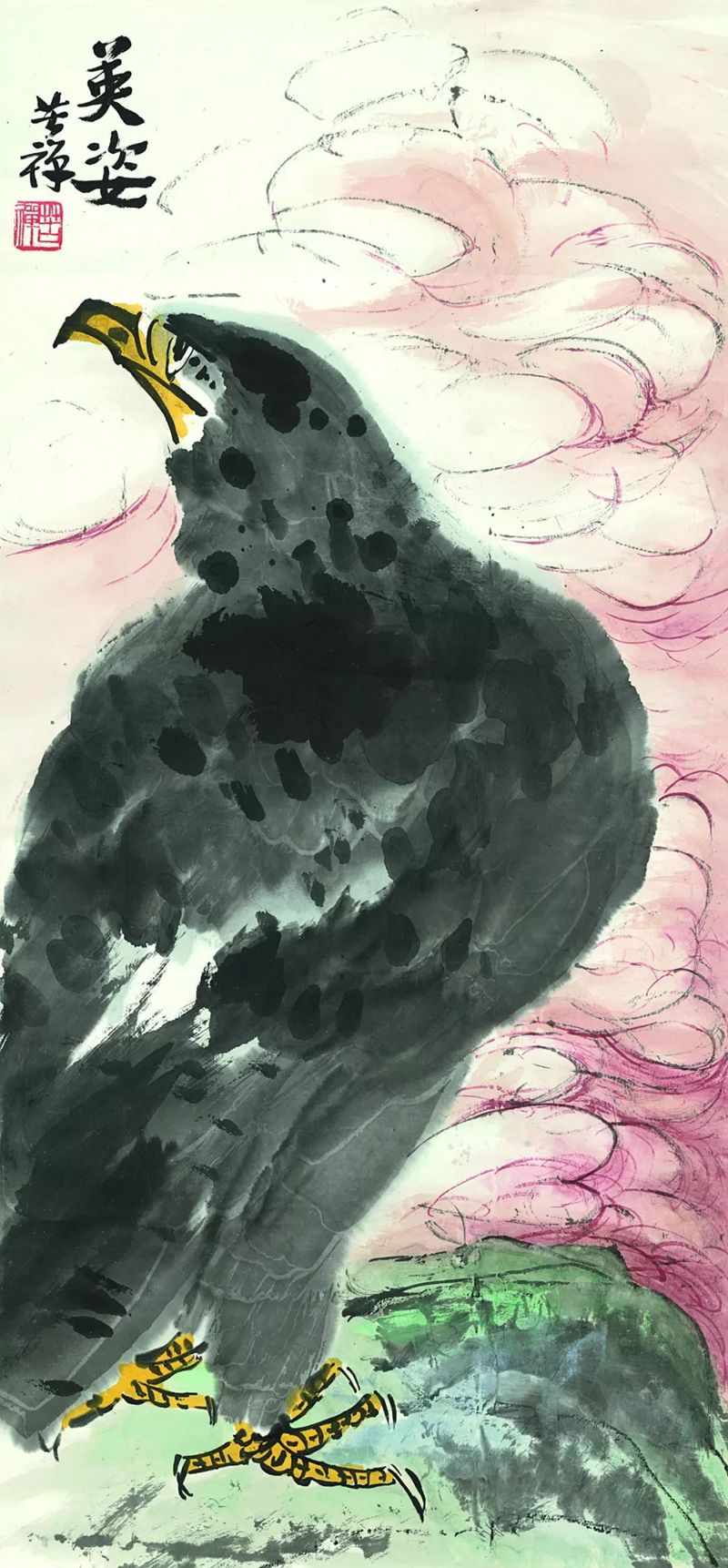 《英姿圖》,作于抗戰(zhàn)時期。幾乎從不愛畫背景的李苦禪,在這幅雄鷹身后渲染了烽火連天的氣氛,又以青綠山水法以寓祖國大好河山。憤然昂首之鷹,加以“英姿”點題,彰顯了抗戰(zhàn)必勝的信念