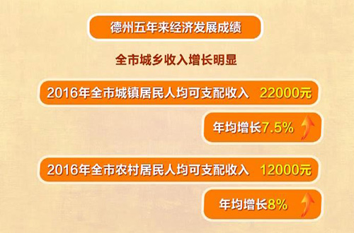 有這樣幾組數(shù)據(jù),印證著德州五年來(lái)經(jīng)濟(jì)發(fā)展的成績(jī):2016年,德州的地區(qū)生產(chǎn)總值2945億元,五年來(lái)年平均增長(zhǎng)9.9%。固定資產(chǎn)投資2529億元,年均增長(zhǎng)17%;公共財(cái)政預(yù)算收入183.5億元,是2011年的1.9倍。區(qū)域經(jīng)濟(jì)更加活躍,德州經(jīng)濟(jì)技術(shù)開(kāi)發(fā)區(qū)和高新技術(shù)產(chǎn)業(yè)開(kāi)發(fā)區(qū)成功晉升國(guó)家級(jí)。經(jīng)濟(jì)穩(wěn)步發(fā)展,百姓的生活自然跟著越來(lái)越好,這五年,城鄉(xiāng)結(jié)構(gòu)發(fā)生了歷史性變化,全市常住人口城鎮(zhèn)化率達(dá)到53.5%,比2011年提高11.1%。全市城鄉(xiāng)收入增長(zhǎng)明顯。2016年,全市城鄉(xiāng)居民人均可支配收入分別達(dá)到22000元和12000元,年均增長(zhǎng)7.5%和8%。