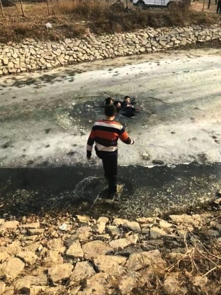 2月17日,農(nóng)歷大年初二,山東沂南縣蘇村鎮(zhèn)牛家小河村村民牛恩利去湖頭鎮(zhèn)上房家溝村岳父家拜年,誰知走到上房家溝村水庫邊,卻看到有三個孩子抱在一起漂浮在水庫中央的冰窟窿里,水庫去年剛剛清淤,水很深,情況十分危急。見此情景,牛恩利二話沒說就跳了下去。