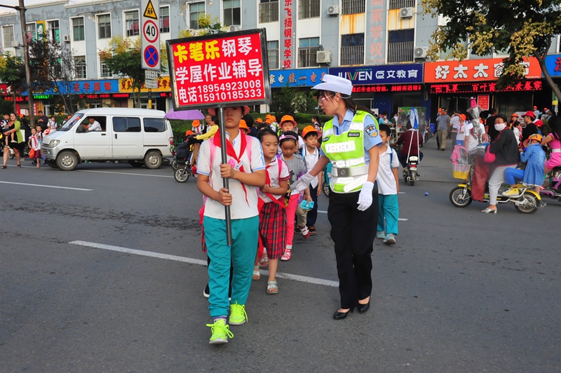 “警察叔叔好、阿姨好”,看到執(zhí)勤民警,同學(xué)們總是高興的和他們打招呼,“同學(xué)們好,路上慢點(diǎn),靠右行走,注意紅燈,過馬路要走斑馬線”,臨沂河?xùn)|交警民警總是耐心提醒著每一個(gè)過往學(xué)生。上下學(xué)的路上,他們不停揮動(dòng)手臂提醒過往車輛學(xué)校路段減速慢行,指揮駕駛員為學(xué)生過馬路讓出一條平安通道。他們牽著學(xué)生的手避開來來往往的車流、越過熙熙攘攘的人群,將學(xué)生護(hù)送到安全地點(diǎn)。他們?yōu)榻铀蛯W(xué)生的家長送上交通知識,和家長們一同守護(hù)學(xué)生平安。他們和學(xué)生們一起走過春夏秋冬,歷經(jīng)寒風(fēng)暴雨,每一個(gè)助學(xué)崗都有他們的身影,他們用愛呵護(hù)著每位學(xué)生的安全,學(xué)生們的平安是他們最大的幸福。