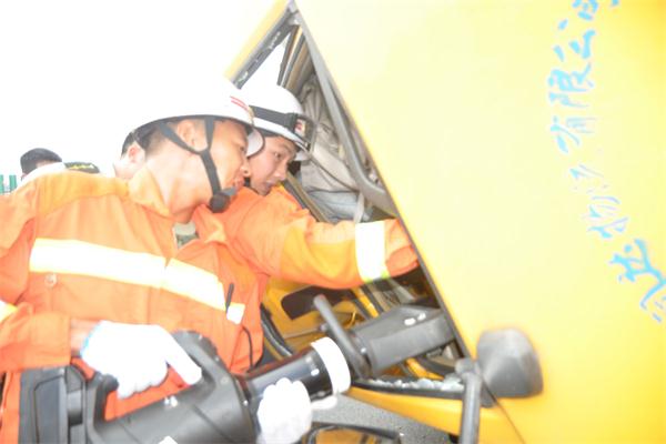 到達(dá)事故現(xiàn)場(chǎng)后,指揮員對(duì)現(xiàn)場(chǎng)進(jìn)行了勘察,發(fā)現(xiàn)是一輛大貨車追尾,車頭已嚴(yán)重變形,一名男子被困車內(nèi),頭部和右側(cè)身體被變形的車門死死壓住,因頭部臉頰血流不止,意識(shí)已模糊不清 。針對(duì)偵查的情況,指揮員迅速下達(dá)作戰(zhàn)命令,由一組人員負(fù)責(zé)現(xiàn)場(chǎng)警戒,防止意外造成二次傷害。另一組人員液壓剪破拆工具組進(jìn)行破拆擴(kuò)張,隨著操作時(shí)間的進(jìn)行,施救空間在不斷擴(kuò)大,經(jīng)過一個(gè)多小時(shí)的施救,被困司機(jī)被成功救出并送上120救護(hù)車。
