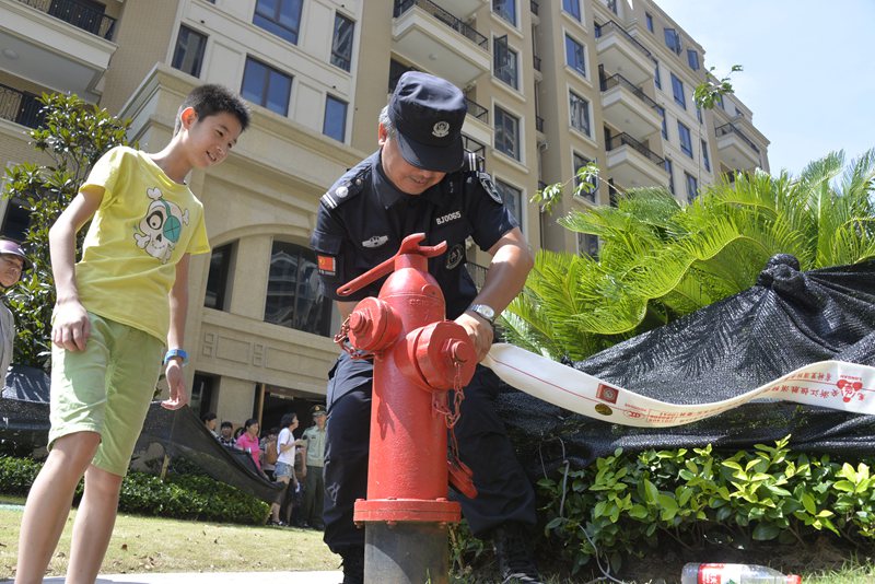 一名高層住宅小區(qū)物業(yè)保安人員將水帶接到消火栓取水開(kāi)展演練