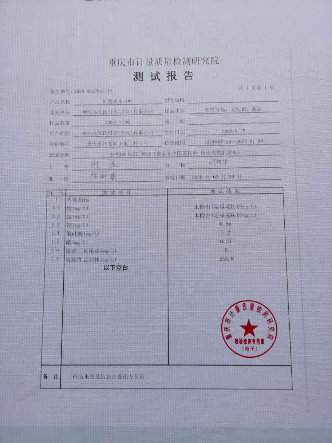 一、富硒高氧水含硒量0.21mg/1L以上。負(fù)電位-1200mv,負(fù)離子原液稀釋200倍后,每立方厘米負(fù)離子4萬(wàn)個(gè)以上,負(fù)離子作為一種粒子與人體細(xì)胞原子的電子有著相同波長(zhǎng),與之產(chǎn)生量子共振效應(yīng),活化休眠細(xì)胞。
