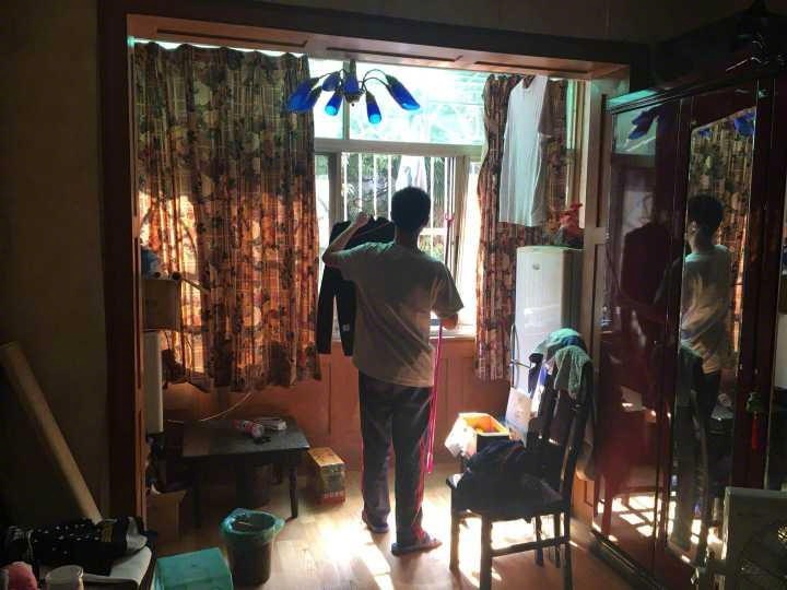 雨棚下,晾曬的校服已經(jīng)干透,他麻利地取下來,一一掛到衣櫥里,又拿起褲架掛校服褲。