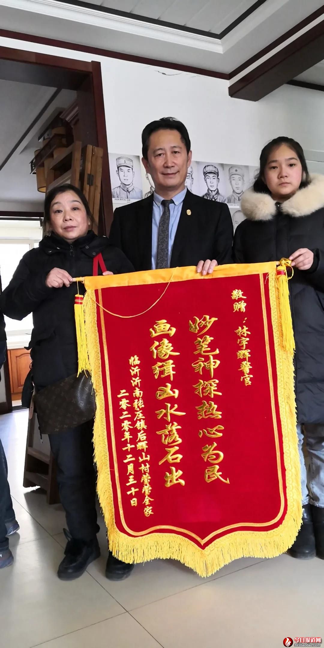 今天,受害人的妻子和女兒來到了山東濟(jì)南林警官的工作室,獻(xiàn)上了錦旗:妙筆神探熱心為民,畫像緝兇水落石出。錦旗飽含了母女二人的謝意。