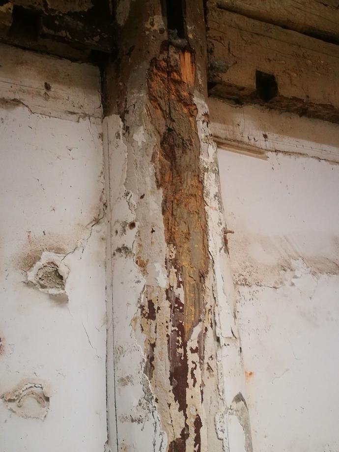 比較年歲久遠,生活日報記者看到,有些原木的地步已經(jīng)腐爛,有的很比較嚴重。而且大殿的內(nèi)側(cè),能夠看到有裝修過的痕跡,很多的現(xiàn)代建筑材料也和這些砍成文物的老建筑粘在一起。墻壁非常的殘破,有修補的痕跡,很多地方露著磚塊。