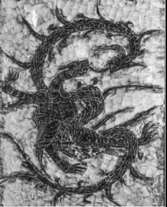 蛇的形象在一般漢墓中不多,在北寨漢墓中有兩處,其中一處位于前室北壁中間立柱的下部,蛇與龜相繞,組成“玄武”,“玄武”是四神之一,主北方。另一處位于前室北壁橫額上。
