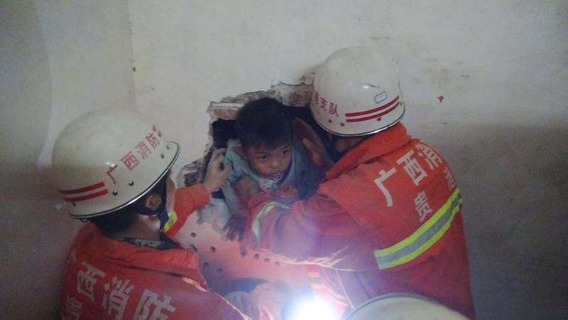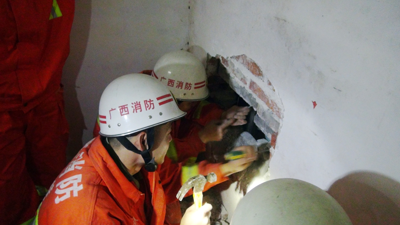 廣西桂平:6歲頑皮小孩鉆墻縫被卡 消防鑿360平厘墻洞營救