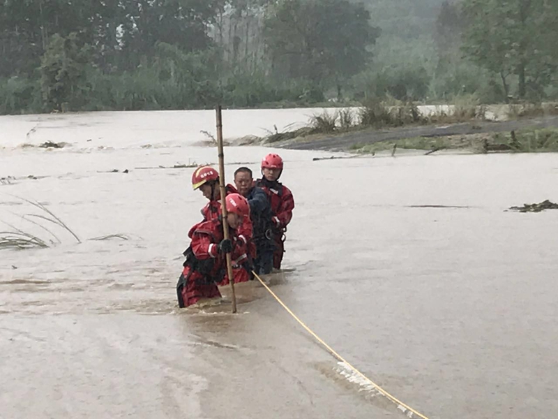 7時(shí)50分,東江中隊(duì)第一救援力量到達(dá)現(xiàn)場(chǎng),發(fā)現(xiàn)現(xiàn)場(chǎng)水流渾濁湍急,在花江下游河段河水已經(jīng)瞞過(guò)河堤淹沒(méi)了兩旁旁邊村莊和田地,通往堯山的道路多處被水淹沒(méi)。據(jù)村里人介紹:由于凌晨開(kāi)始下暴雨以及上游水流下來(lái),導(dǎo)致河流水位上漲淹沒(méi)村莊,附近大部分人員已平安轉(zhuǎn)移到安全地方。但是河岸上游一所學(xué)校內(nèi)有一人被困,河岸下沿仍有十幾個(gè)人沒(méi)來(lái)得及出來(lái)被困在家中和道路上,家里的水已經(jīng)到大腿了,外面的水有深有淺,深的地方有一米多深,能沒(méi)到胸部。里面還有一個(gè)養(yǎng)豬場(chǎng),養(yǎng)豬場(chǎng)里有一百多頭豬被淹。” 現(xiàn)場(chǎng)指揮員立即將隊(duì)伍分成兩組,一組負(fù)責(zé)營(yíng)救學(xué)校被困人員,一組跟隨當(dāng)?shù)卮迕駹I(yíng)救村里被困人員,由于河水湍急,救援人員無(wú)法沿道路到達(dá)被困地點(diǎn),中隊(duì)指揮員向村民詢問(wèn),發(fā)現(xiàn)附近有一條通道水流比較緩慢,救援人員可以涉水進(jìn)入內(nèi)部營(yíng)救被困人員。指揮員讓兩人留守現(xiàn)場(chǎng)負(fù)責(zé)接應(yīng)涉險(xiǎn)從道路上淌水出來(lái)的被困人員,其余人員跟誰(shuí)村民從后方進(jìn)入村莊實(shí)施救援。