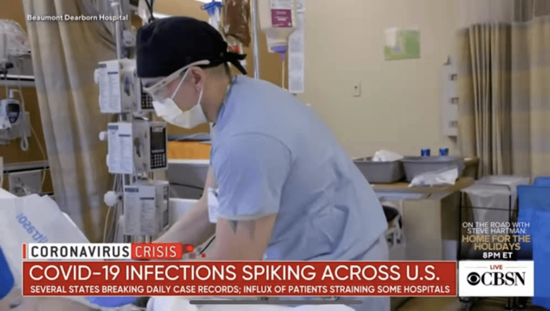 美國多個州打破新冠肺炎每日新發(fā)病例記錄 來源:CBS視頻截屏